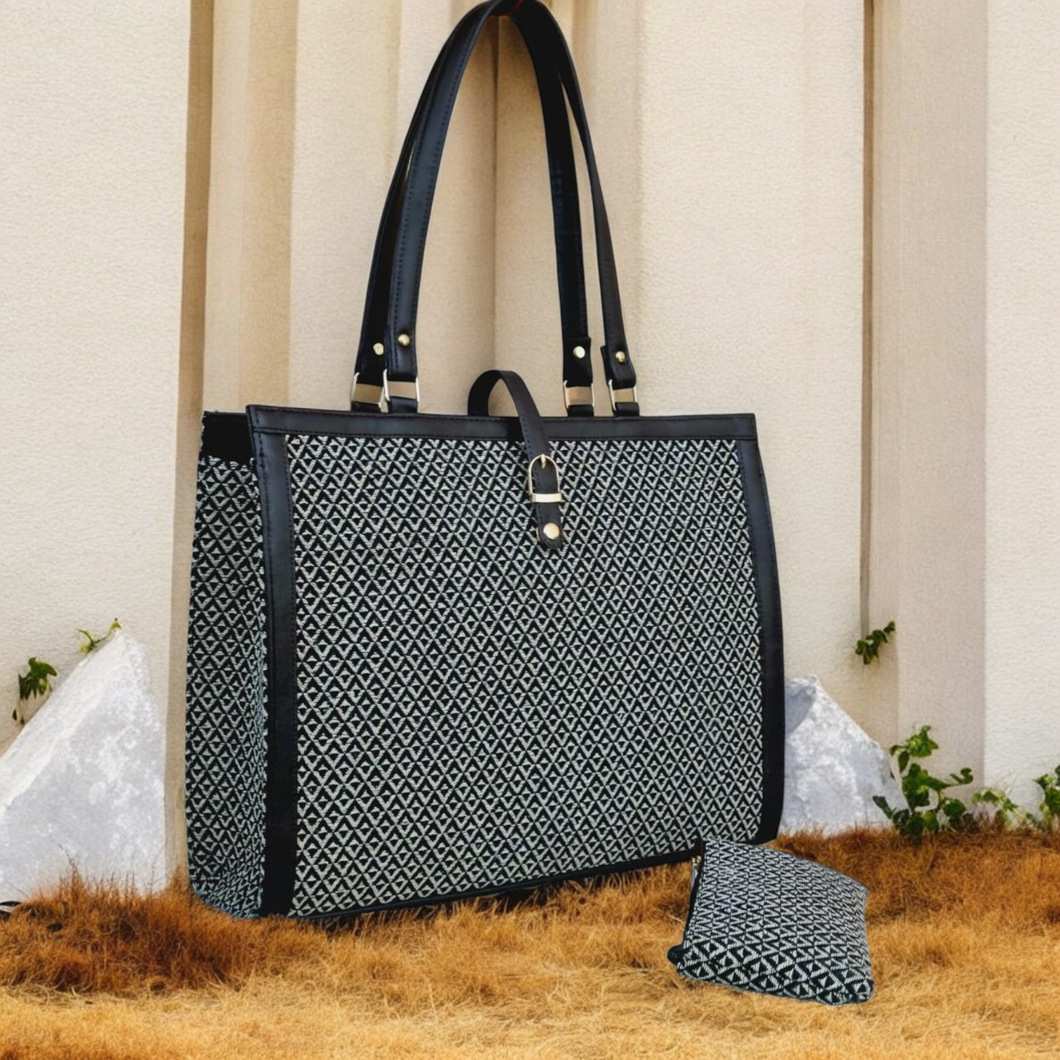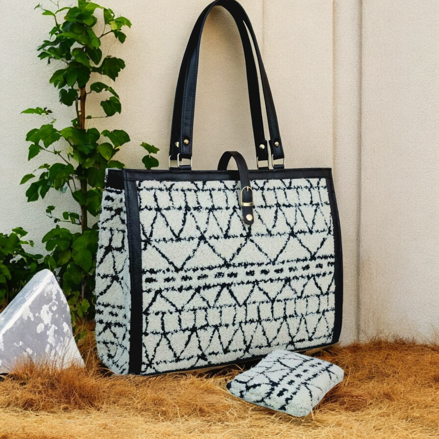 Make a bold, sophisticated statement with this monochrome tote bag and matching pouch set. This bag features a distinctive tufted fabric exterior that gives it a beautiful, soft, and tactile finish, reminiscent of a shaggy rug or fleece.