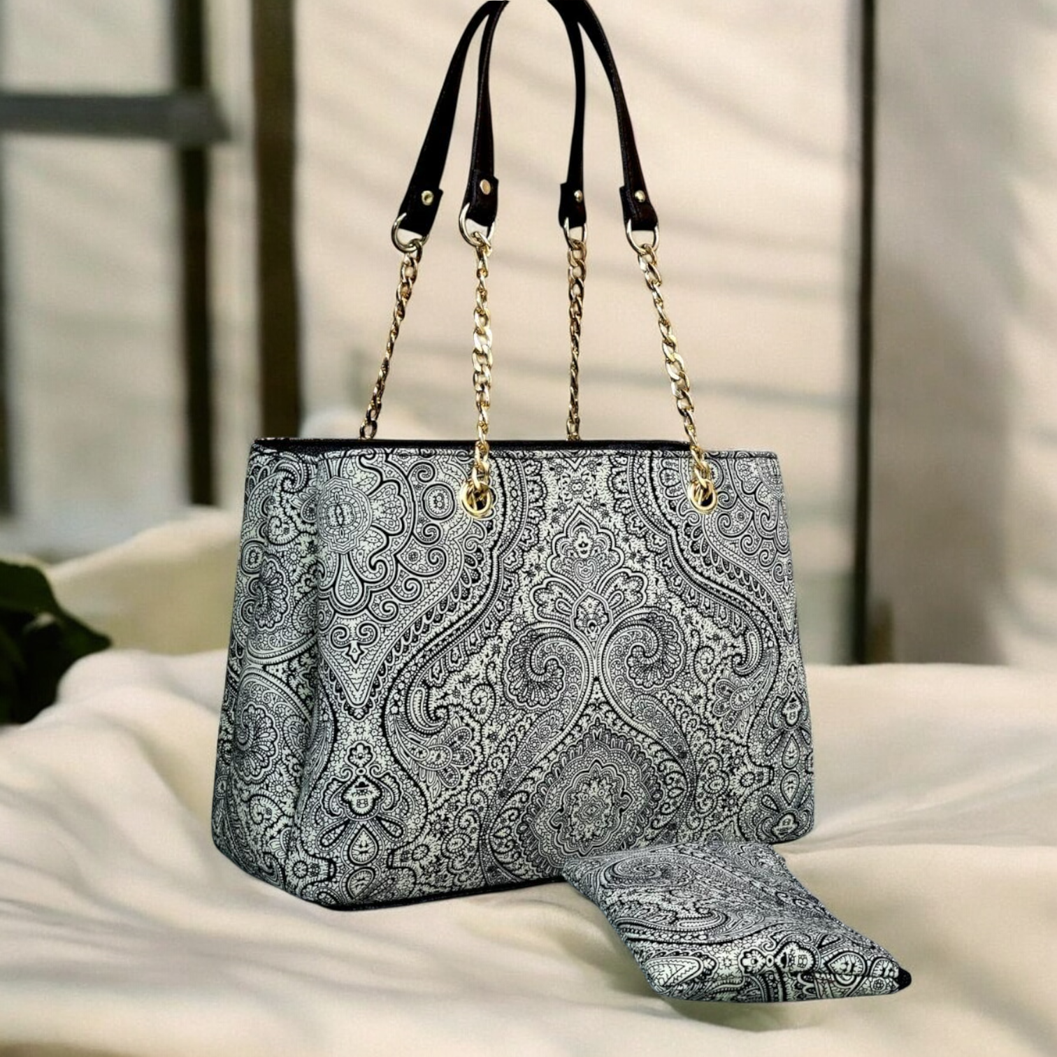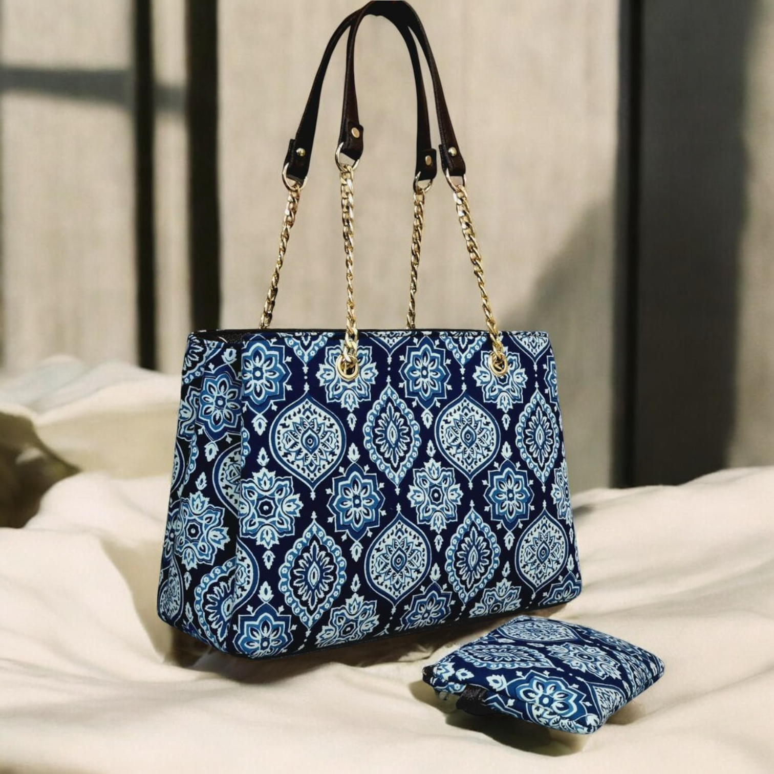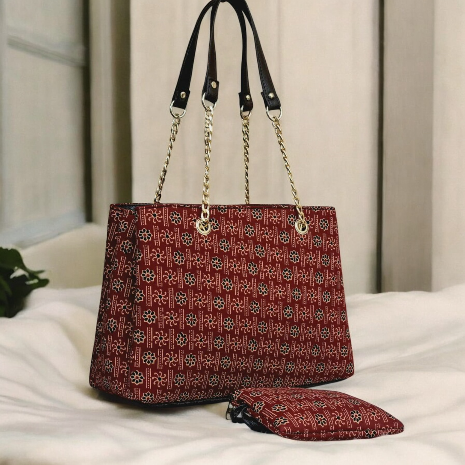 Step out in style with this stunning, spacious tote bag and matching pouch combo. Featuring a rich base and an intricate ethnic floral block print-style pattern in multiple colors accents, this set effortlessly blends traditional artistry with modern utility.