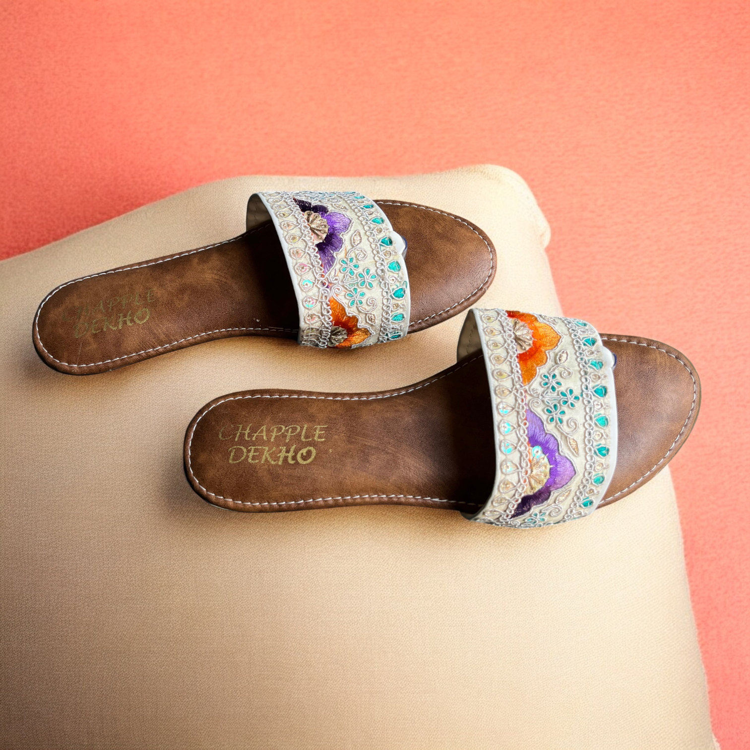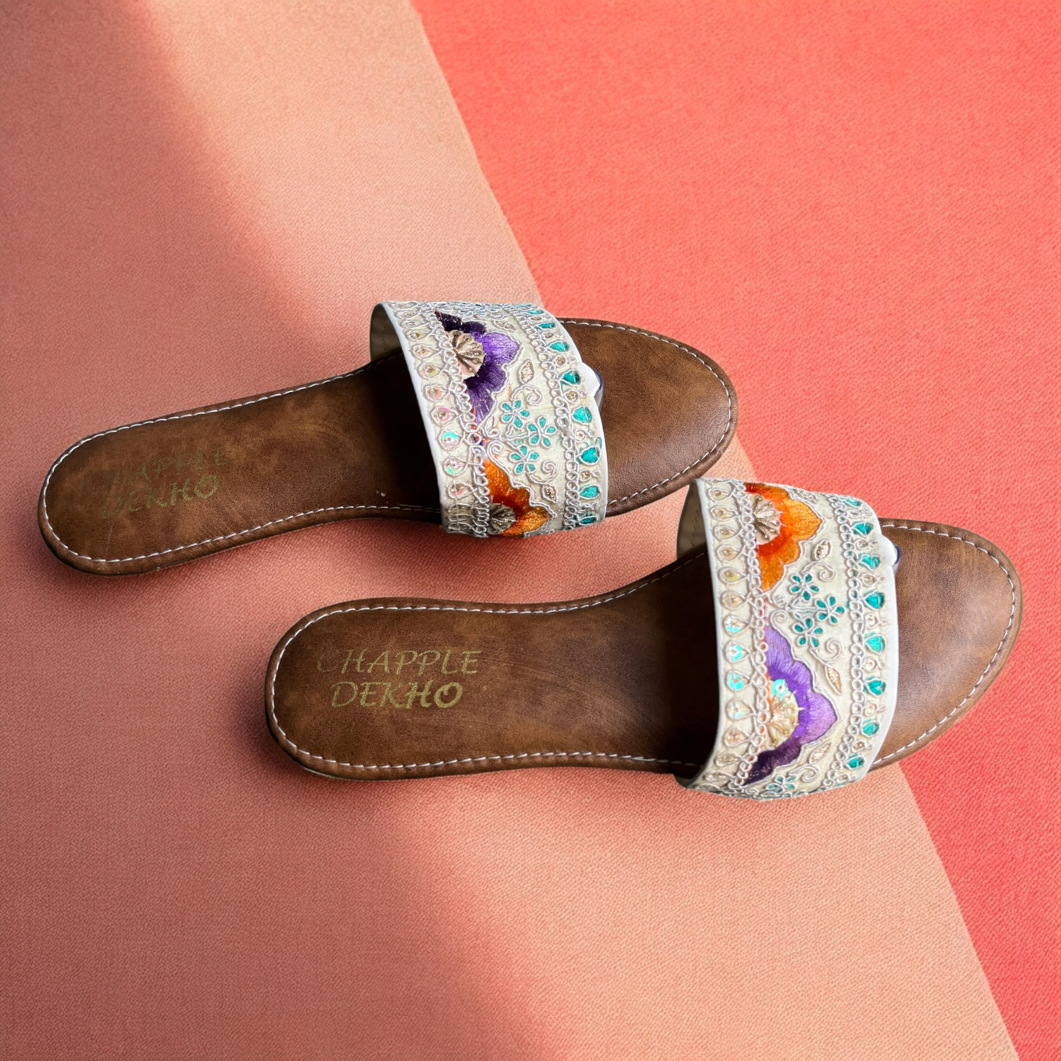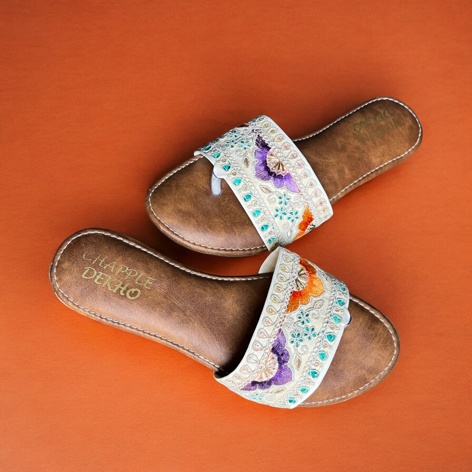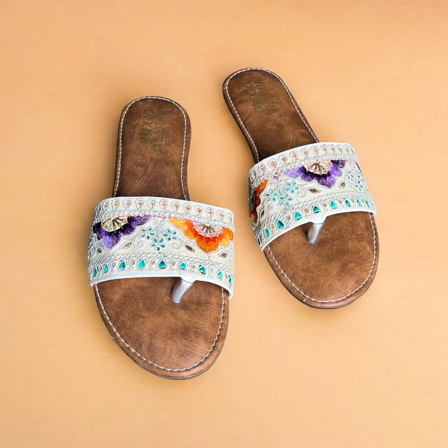 Experience the subtle elegance of our "Lavender Bloom" Flat Sandals. These beautiful slides feature a rich, wide strap of pristine white, adorned with exquisite hand-embroidered details. The intricate design showcases lovely floral and paisley motifs rendered in soft pastel shades of lavender, deep purple, burnt orange, and calming teal. The detailed threadwork brings a sophisticated, handcrafted touch to the footwear.