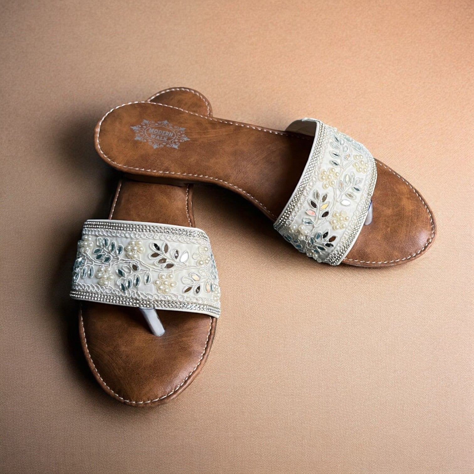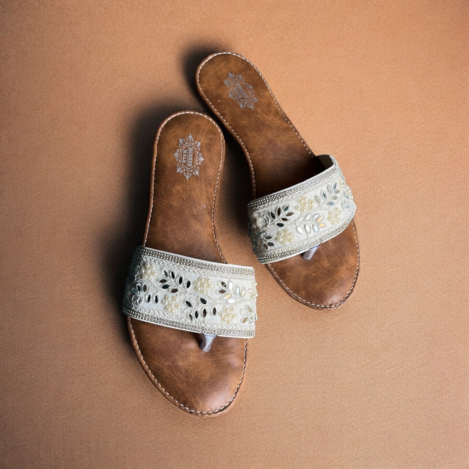 Illuminate every step with our dazzling "Shimmering Pearl & Mirror Work" Festive Sliders. These exquisite flat sandals are designed to add a touch of opulent glamour to your ensemble. The broad, elegant white strap is meticulously adorned with a captivating array of shimmering mirror work and delicate faux pearls, creating a luxurious visual tapestry. Each element is carefully placed to catch the light, ensuring you sparkle at every occasion.