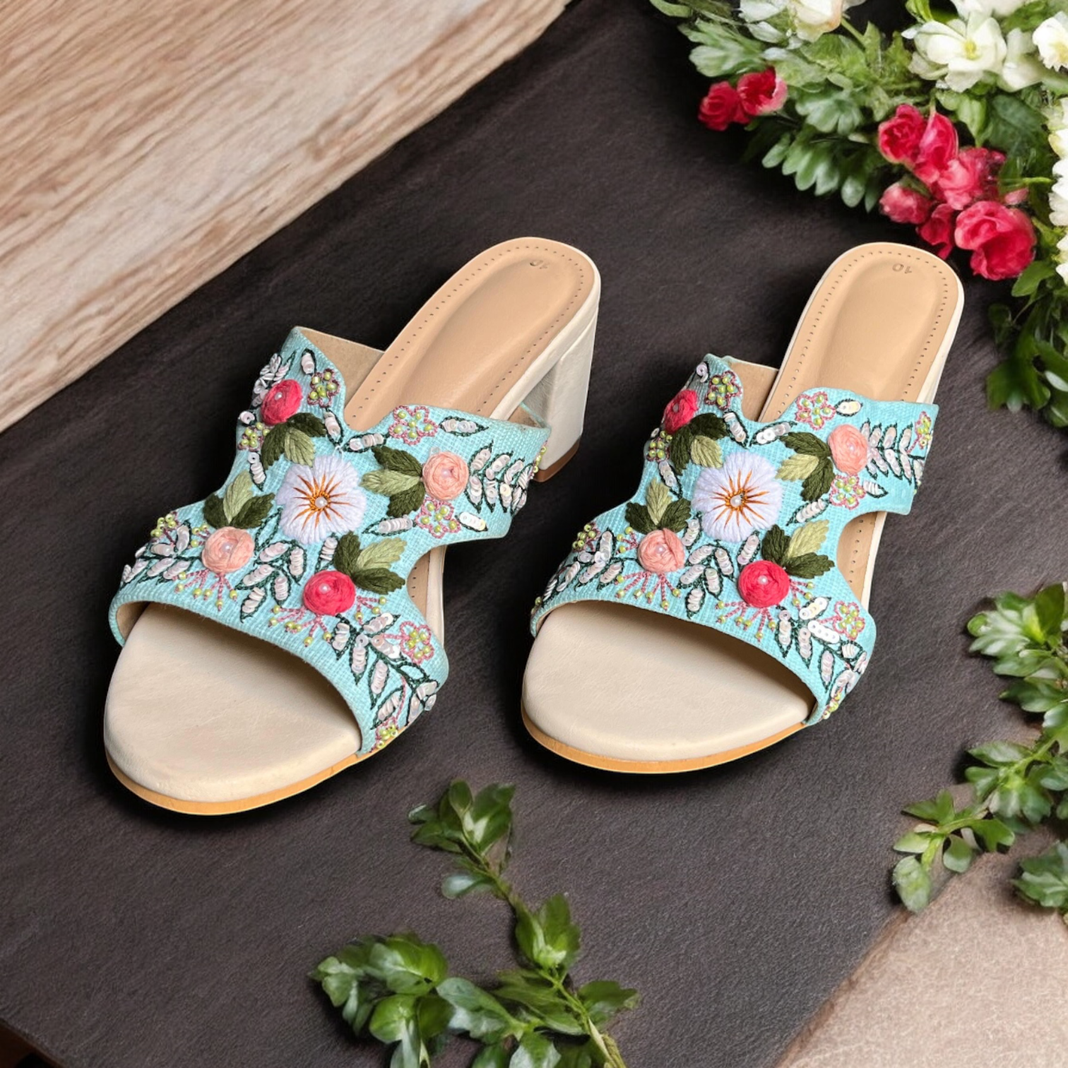 Step into enchanting elegance with our Hand-Embroidered Flower Slide Sandals with Chunky Heel. These exquisite mules feature a delicate aqua blue base, meticulously adorned with vibrant, hand-embroidered floral motifs that evoke the beauty of a blooming garden. Designed for both comfort and style, the sturdy block heel provides a graceful lift, while the open-toe slide design ensures effortless wear. Perfect for spring brunches, summer soirées, or simply adding a touch of sophisticated charm to your everyday ensemble. Each pair is a testament to artisan craftsmanship, making them a truly unique addition to your footwear collection.
