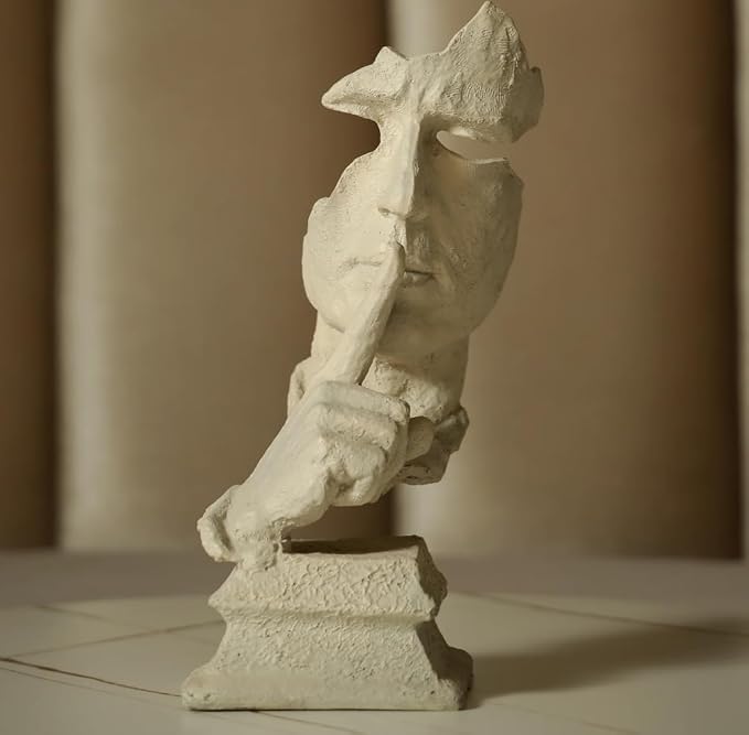 The Silent: A dramatic, tall abstract statue showing a face with a hand placed over the mouth. It embodies the powerful message of "Speak No Evil," advocating for thoughtfulness in communication. Its clean lines and singular focus draw the eye, making it an excellent focal point in your living space or study.