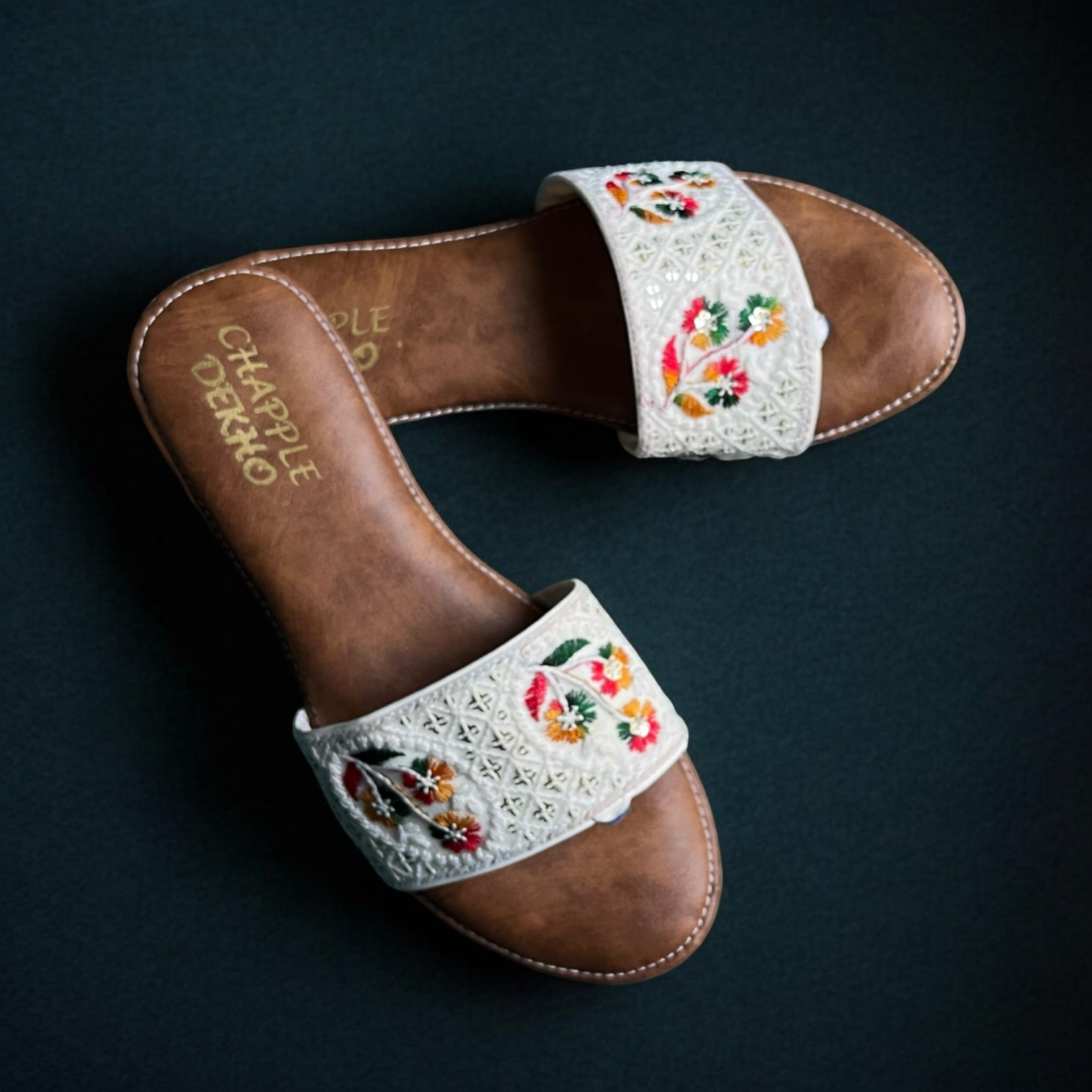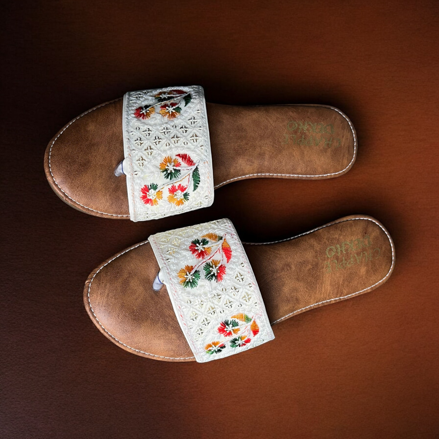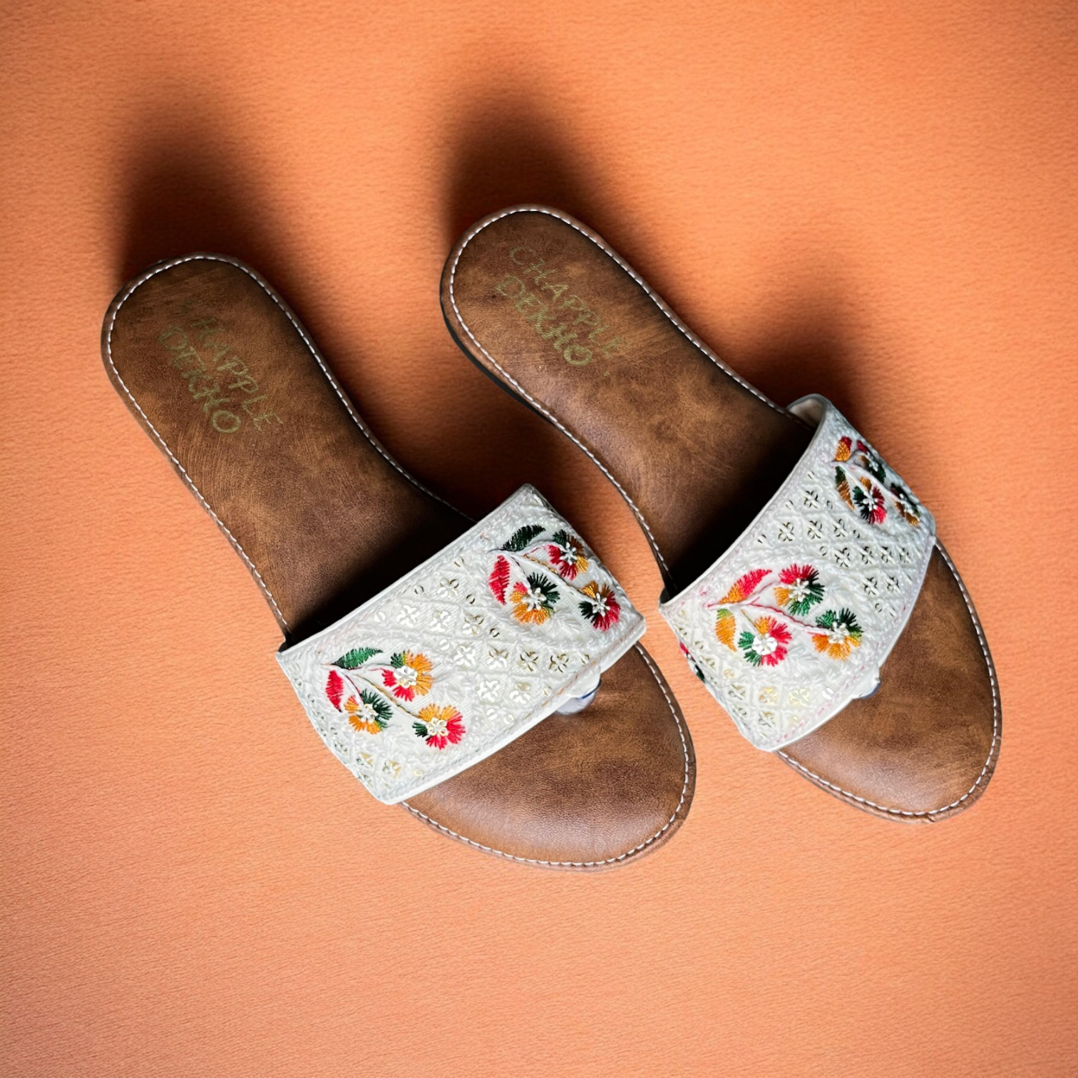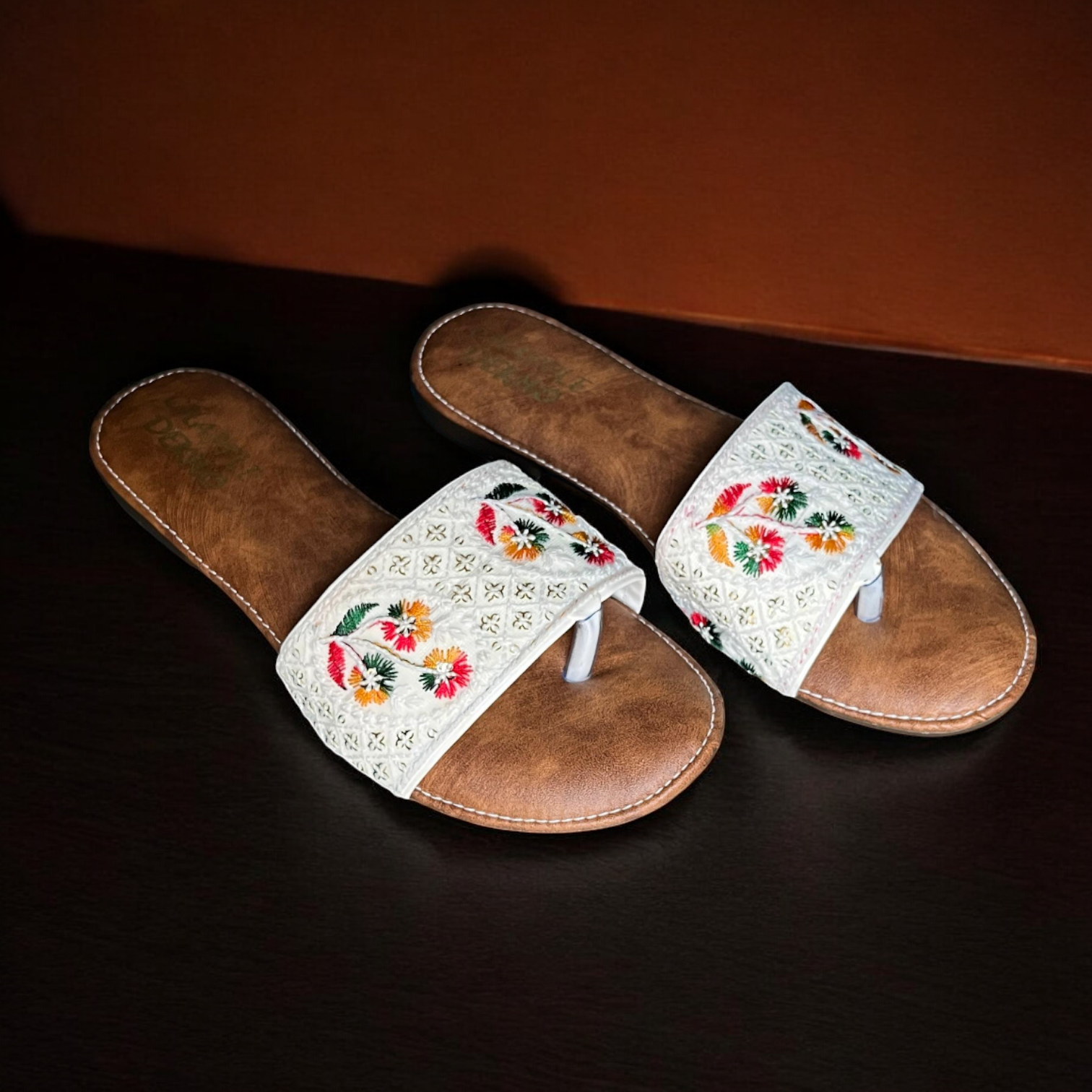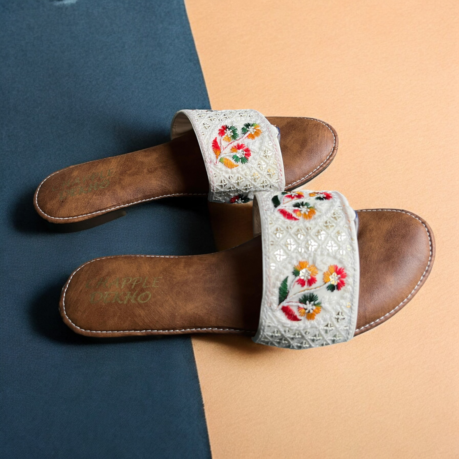 Brighten up your everyday and special occasions alike with our delightful "Garden Bloom" Flat Sandals. These charming slides feature a crisp white wide strap, beautifully adorned with vibrant floral embroidery in a cheerful palette of red, orange, green, and yellow threads. The intricate stitch work creates a textured and visually appealing design that adds a pop of color to any ensemble.