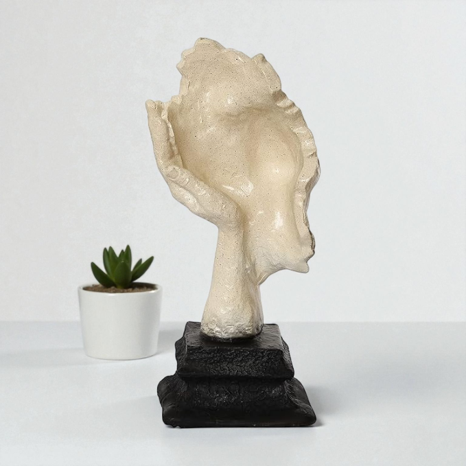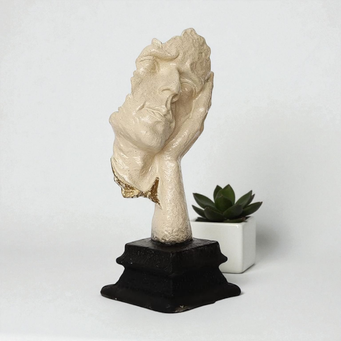Make a statement about introspection and deep thought with this compelling Abstract Contemplation Sculpture. This piece features a fragmented human face cradled in a hand, representing concepts like listening to inner wisdom, reflection, or "Hear No Evil." The artwork is designed to add an intellectual and artistic flair to your space.